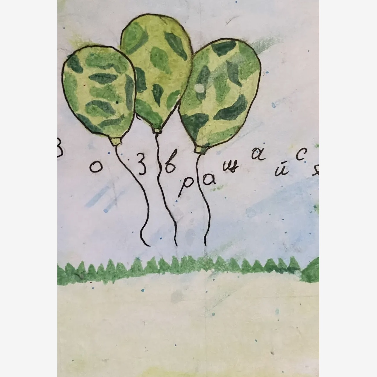 На рисунке изображены воздушные шары, окрашенные в камуфляж цвета хаки, как напоминание солдатам на СВО о том, что их очень ждут дома.