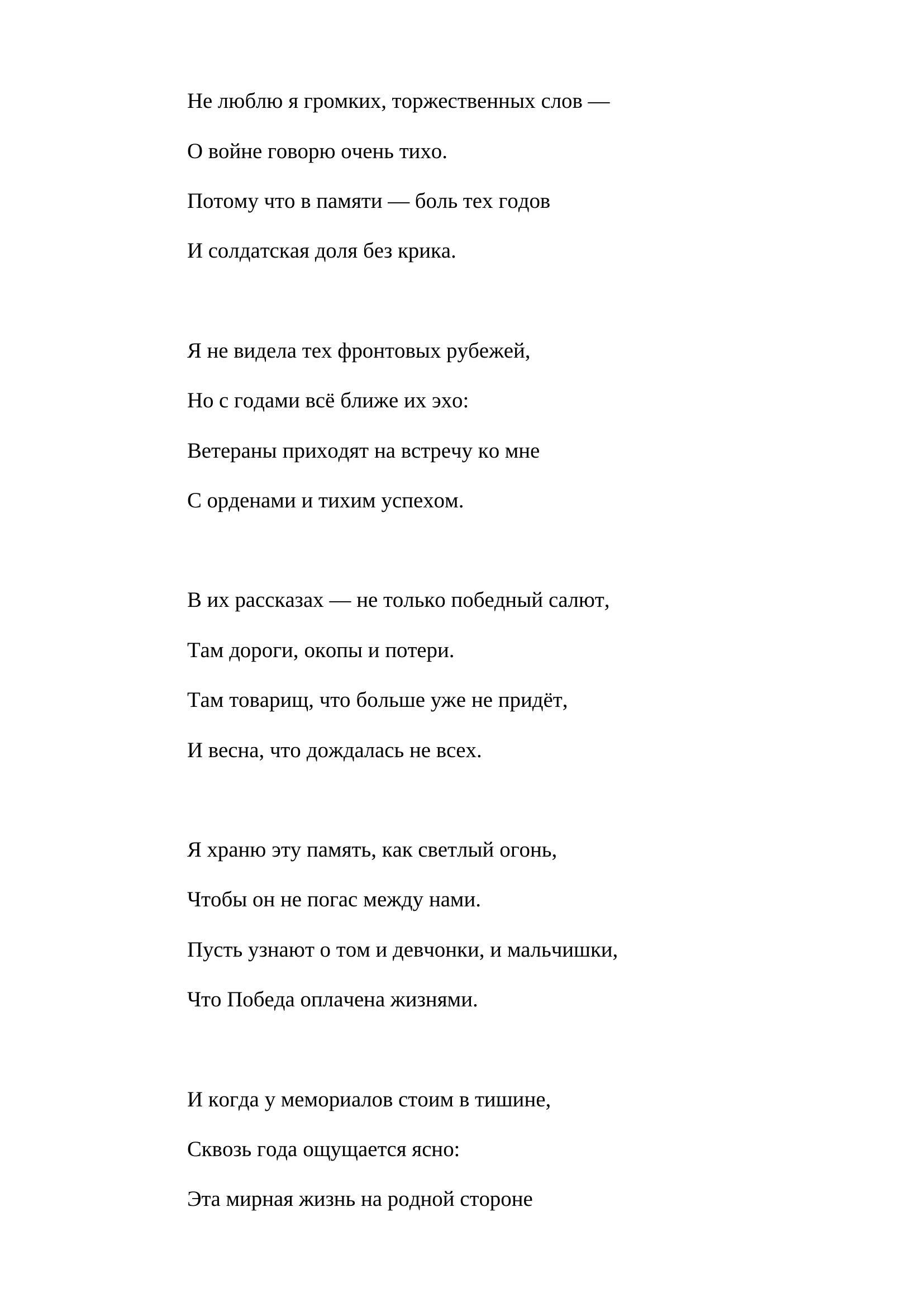 Стихотворение «Память сильнее времени» — это тихое и искреннее размышление о памяти Великой Отечественной войны и о людях, которые пронесли её через всю жизнь. В стихе говорится о войне без громких слов и пафоса, через личные встречи с ветеранами, их воспоминания и судьбы. В этих рассказах звучит не только радость Победы, но и боль утрат, фронтовые дороги, товарищи, которые не вернулись домой.